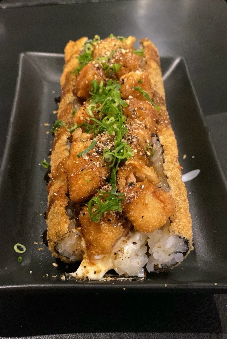 Arroz japonês, alga marinha, salmão em cubos empanado, cream cheese, cebolinha, e tarê.